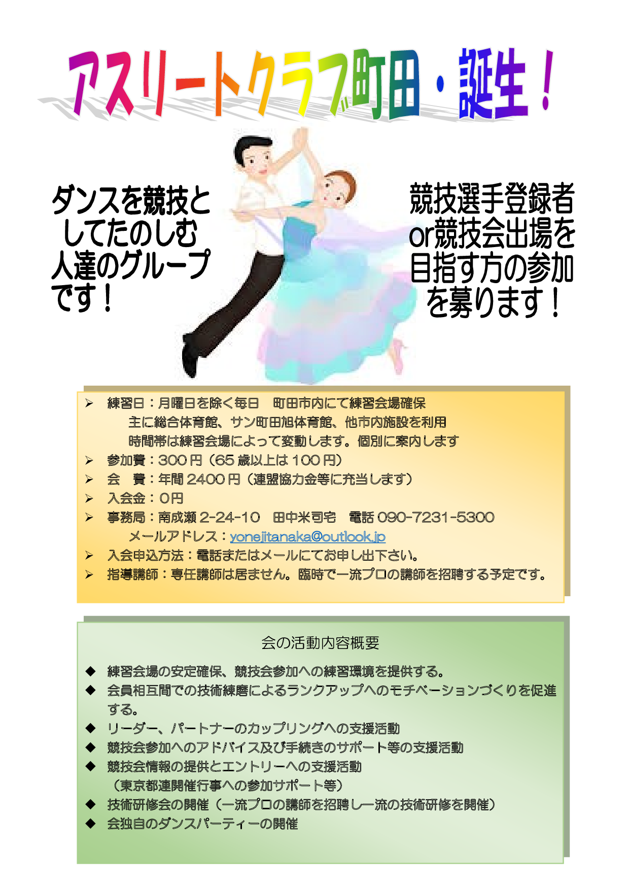 新サークル「アスリートクラブ町田」が新規会員を募集しています! 会員募集 2026.03.112026.04.18 ダンスを競技としてたのしむ人達のグループです! アスリートクラブ町田 誕生! 競技選手登録者 or 競技会出場を目指す方の参加を募ります!