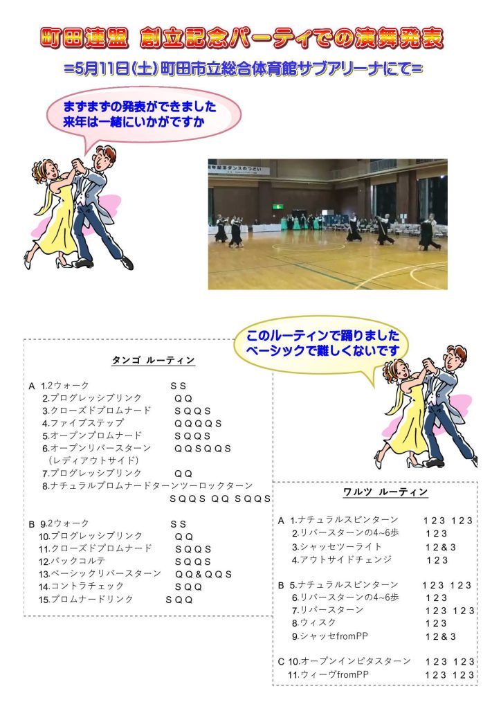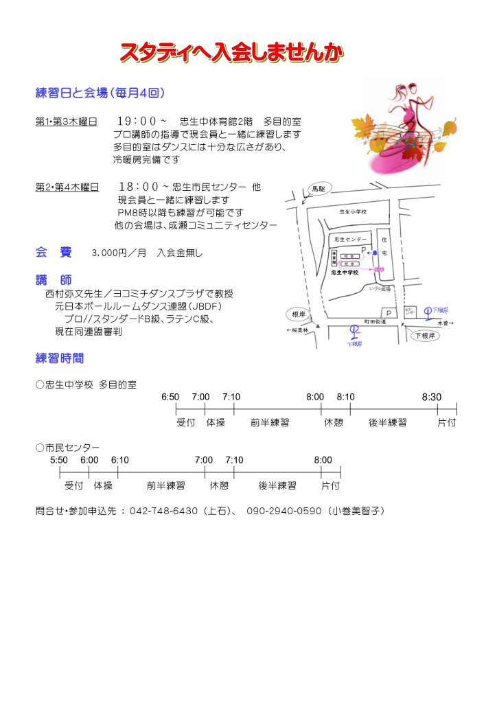 | 第1・第3木曜日 | 19:00~20:30 忠生中体育館 2階多目的室 プロ講師の指導で現会員と一緒に練習します。 多目的室はダンスには十分な広さがあり、冷房完備です。 |