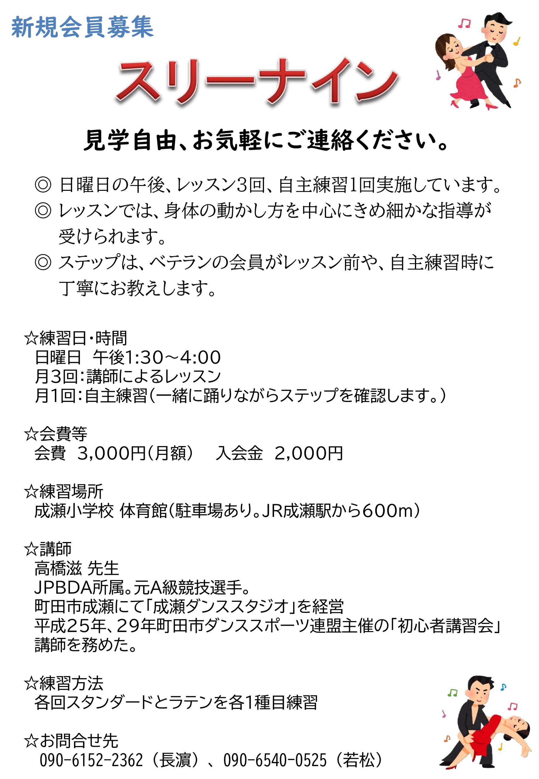 「スリーナイン」が「新規会員募集」のお知らせ 会員募集 2026.03.11 スリーナイン見学自由、お気軽にご連絡ください。 日曜日の午後、レッスン3回、自主練習1回実施しています。 レッスンでは、身体の動かし方を中心にきめ細かな指導が受けられます。 ステップは、ベテランの会員がレッスン前や、自主練習時に 丁寧にお教えします。